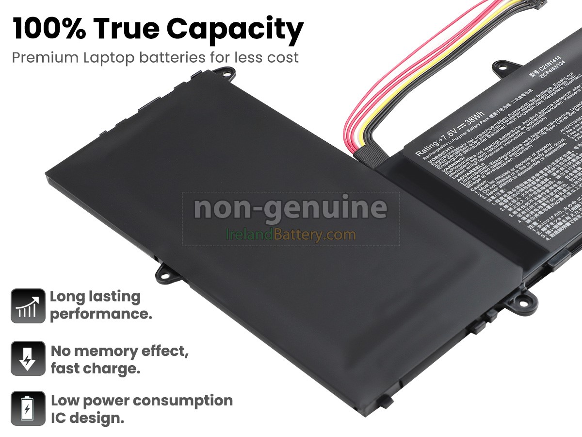 2 cells 38Wh Asus C21N1414 excellent quality battery uses an intelligent control chip, which comes with higher performance and reliability, longer run-time and battery life. Built-in protection circuitry ensures its stability and safety, fast charge but slow power consumption.
