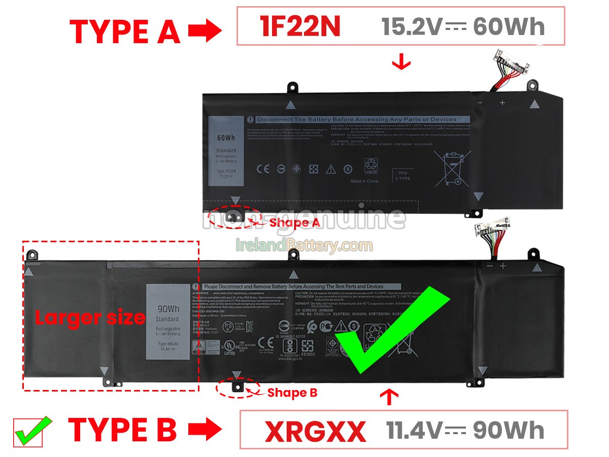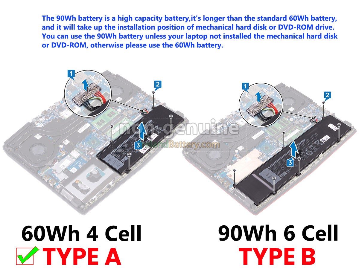 Note :1. 15.2V and 14.8V are compatible, they are in common use. 2. 11.1V and 11.4V are compatible, they are in common use. 3. This is a high capacity(90Wh) battery,it's longer than the standard 60Wh battery, and it will take up the installation position of mechanical hard disk or DVD-ROM drive. You can use the 90Wh battery unless your laptop not installed the mechanical hard disk or DVD-ROM, otherwise please use the 60Wh battery.