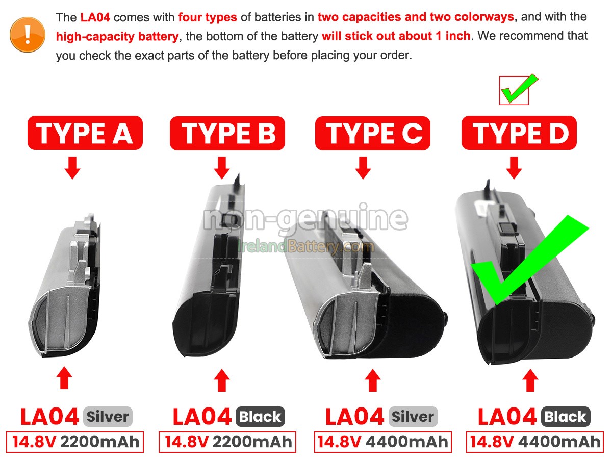 Note : 1. 14.4V and 14.8V are compatible, they are in common use. 2. Please ensure your old battery model is "HP LA04",not "HP OA04", since "HP LA04" and "HP OA04" batteries are very similar, but not the same battery.3. The 4400mAh(8 Cells) battery will extend out about 1 inch from the bottom of the laptop, bigger size but lasting longer.